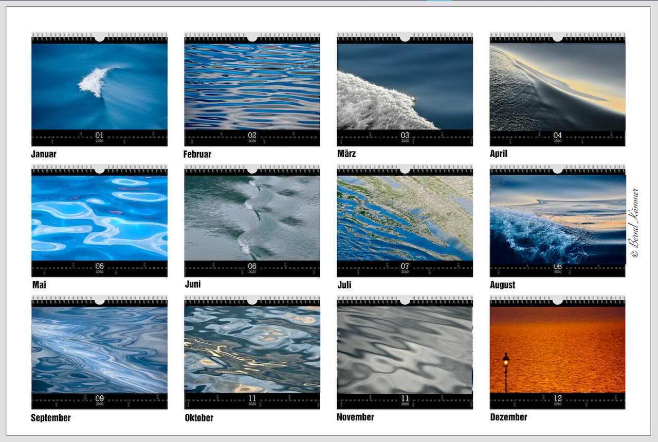 Wasser ist stets im Fluss, stets in Bewegung. Bei diesen Aufnahmen wurden Momente des Stillstands eingefangen, in der die Dynamik des Wassers erhalten bleibt! Sie zeigt sich mal in sanft gewellten, mal gekräuselten Wellen, in verschiedenen Blautönen oder Lichtreflexionen und Schaumkronen, die darauf tanzen. Gefühlvoll spüren die Bilder der kostbaren Gabe Wasser nach, sodass man die Schönheit und Kraft dieses Elements 12 mal im Jahr in verschiedenen Motiven visuell unmittelbar erleben kann.